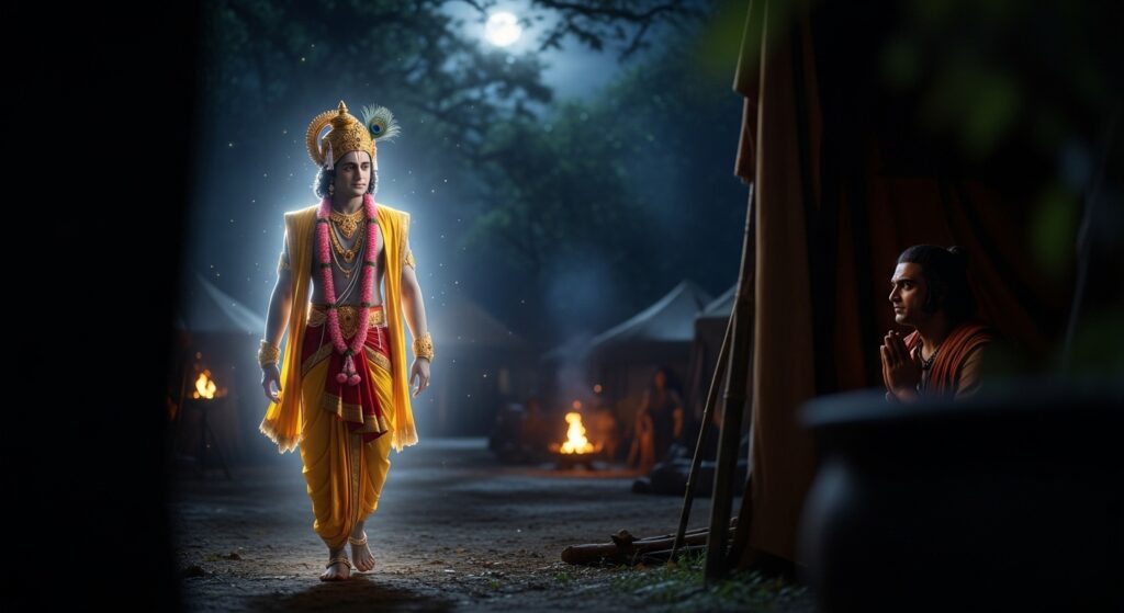 एक रात, जब युद्ध का 12वाँ दिन समाप्त हुआ, पांडव शिविर में सब सो चुके थे। केवल अर्जुन जाग रहे थे, अपने बाणों को साफ करते हुए। तभी उन्होंने देखा कि श्रीकृष्ण चुपचाप शिविर से बाहर निकल रहे हैं।