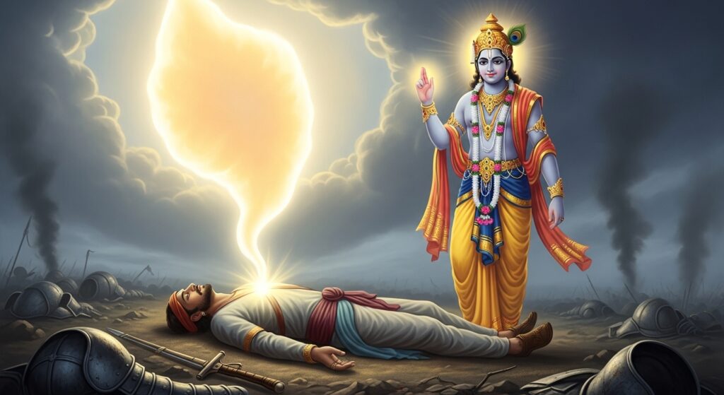 इतना कहकर उन्होंने अपनी दिव्य ऊर्जा से उस सैनिक को शांति प्रदान की। धीरे-धीरे उसका प्राण निकल गया—पर उसके चेहरे पर एक संतोष की मुस्कान थी।