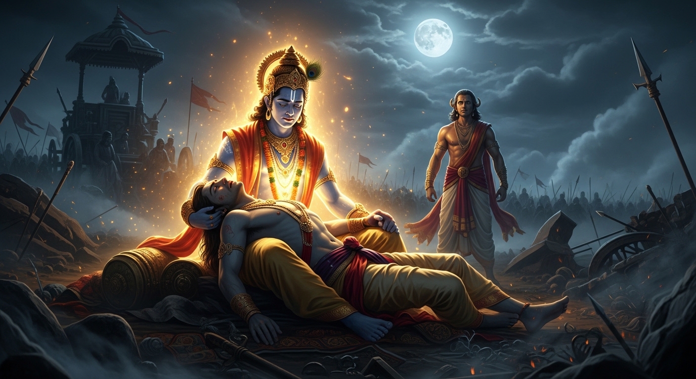 एक रात, जब युद्ध का 12वाँ दिन समाप्त हुआ, पांडव शिविर में सब सो चुके थे। केवल अर्जुन जाग रहे थे, अपने बाणों को साफ करते हुए। तभी उन्होंने देखा कि श्रीकृष्ण चुपचाप शिविर से बाहर निकल रहे हैं।